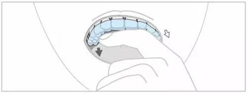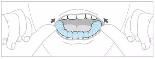 下颌:用手指抠住后牙外侧(即颊侧)的矫治器边缘,向上轻推,两侧交替进行,直至脱离牙齿。