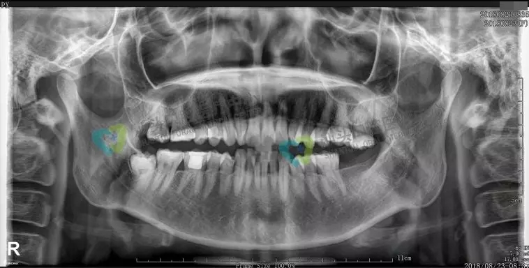 口腔全景牙片,是通过一次拍摄将全口牙齿和颌骨的影像清晰的显示在一张X光片上,可以清晰、完整的显示上颌骨、下颌骨全貌,上下颌牙列情况,牙槽骨情况,能够清晰显示上颌窦腔、窦壁、窦底情况以及颞颌关节情况,并对颌骨周围疾病的诊断提供准确有效的帮助。