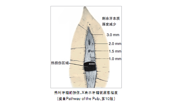 热是损伤牙髓的主要刺激来源。使用旋转器械机械切割牙本质时,可以磨擦产生热量,长时间的产热则有可能造成牙髓的炎症和坏死。此外,过分干燥牙本质和切割时过度施压,也可能造成牙髓组织的不良反应。