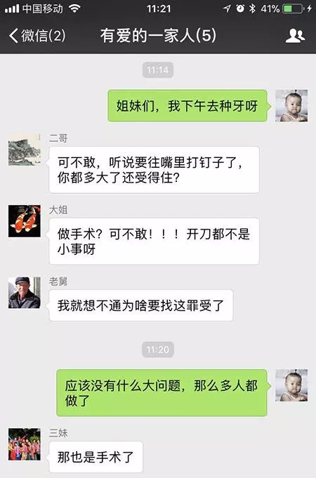 _近,在网上看到一条有趣的朋友圈,里面内容是关于一位缺牙母亲在群里说她儿要带她去种植牙,此话题一出,却纷纷遭到大姐、二哥、老舅的不理解及吐槽。虽然种植牙的人也越来越多,但并不是每个人对种植牙能好好理解,针对里面的聊天内容,对种植牙的误解进行科谱。